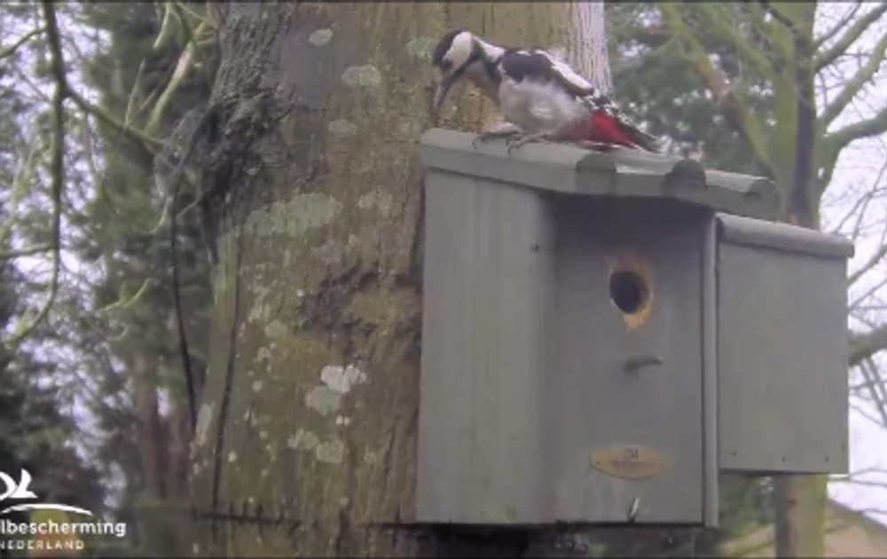 Vrouw koolmees is weer een aantal keren aan komen vliegen met nestmateriaal. Maar niet alles gaat soepel naar binnen, en soms moet ze iets van haar lading laten vallen. Er was ook nog een bliksembezoekje van een grote bonte specht