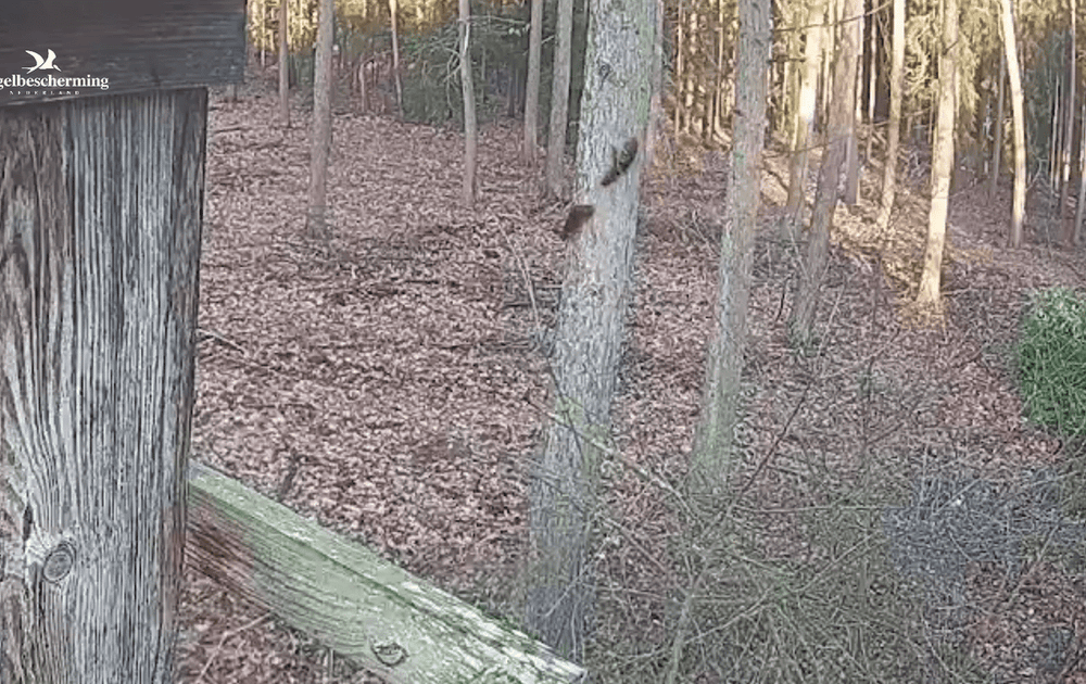Maar buiten de nestkast zijn vandaag en eerder deze week twee eekhoorntjes geweest die de boom vlakbij de nestkast een leuk speelplekje vinden.