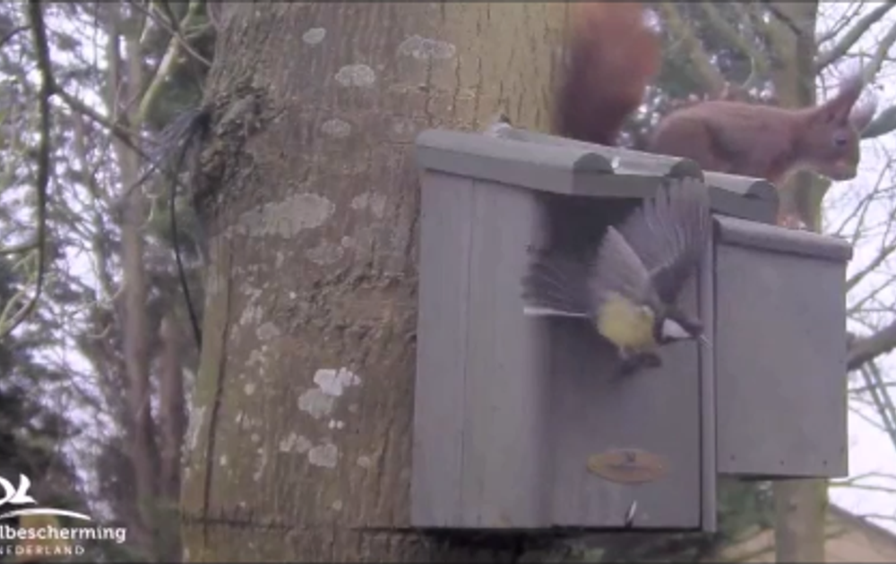 Vandaag had vrouw koolmees haar vleugels vol aan het verjagen van de eekhoorns. Die trokken zich niet al teveel van haar aan. Zij vonden blijkbaar iets eetbaars op de plek waar de kast is bevestigd