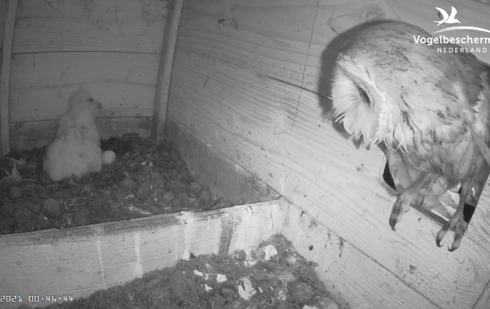 Vrouw uil kwam een beetje nat terug; waarschijnlijk is ze in het natte gras op jacht geweest. Man uil vestigde een seizoenrecord: liefst zeventien prooien bracht hij binnen.