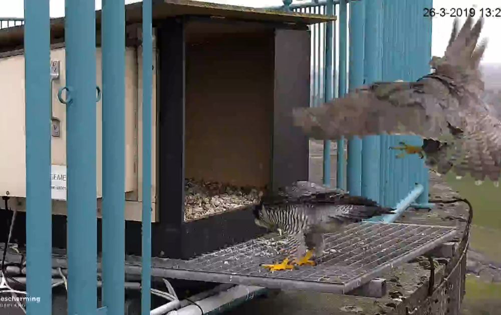 Nadat vrouw de hele nacht gebroed heeft neemt man het voor zessen weer over. Vrouw geniet op het dak van de toren. Na weer een wissel (vrouw op de eieren)komt man op het rooster gevolgd door een vreemde. Vrouw stuurt haar weg, en komt terug met een duif die ze lekker opeet op het dak.Man en vrouw wisselen het broeden keurig af, de nacht is voor de vrouw