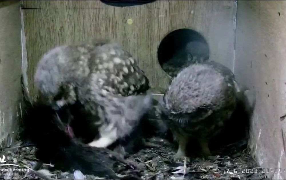 De kuikens bestormen fanatiek maar niet erg effectief vrouw steenuil. Die laat, verstandig als ze is, één kuiken als eerste eten.