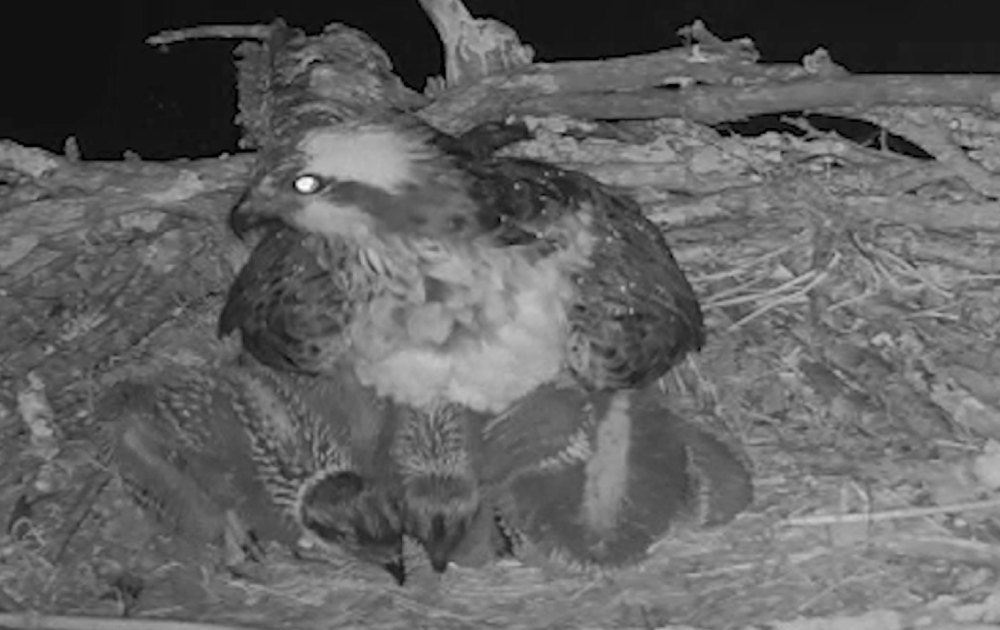 Een moeilijke nacht voor de visarenden. Onweer, regen, grote hagelstenen, alles komt over het nest heen. Gelukkig zijn de kuikens goed beschermd onder moeders veren, al krijgt zij er wel een nat verenpak van.
