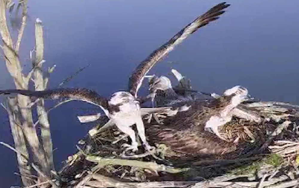 Een roofvogel bevindt zich in het terrein van de twee visarenden. De schaduw laat zien dat het geen kleine vogel is, maar man visarend weet het op te lossen.