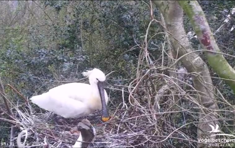 Vanaf gisteravond, maar zeker vanochtend vroeg werd er al steeds getjilp gehoord als de ouder op stond. Of het toen al helemaal uit het ei was gekropen konden we niet zien. Maar om 12:39 mochten we dan eindelijk even een glimp opvangen van het roze wezentje