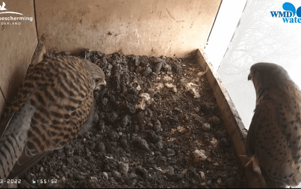 De torenvalken blijven elkaar opzoeken. Op deze mistige ochtend draait vrouw nog maar een kuiltje en hebben ze een heel gesprek.