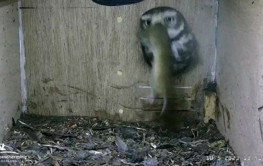 Man steenuil komt een muis brengen die er groot en vet uiziet. Korte staart dus geen rat, maar waarschijnlijk een Rosse woelmuis