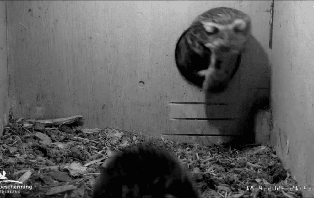 Man steenuil brengt een grote ware muis (lange staart), voedsel voor vrouw steenuil de volgende dag.