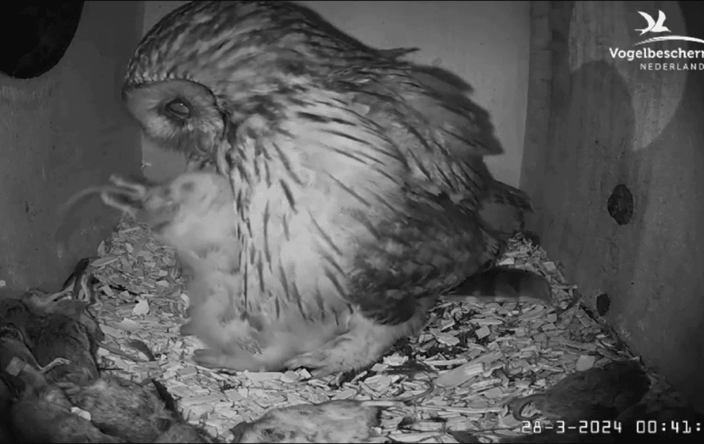 Het kuiken K1 (10 dagen oud) eet een bijna hele muis in één keer op.