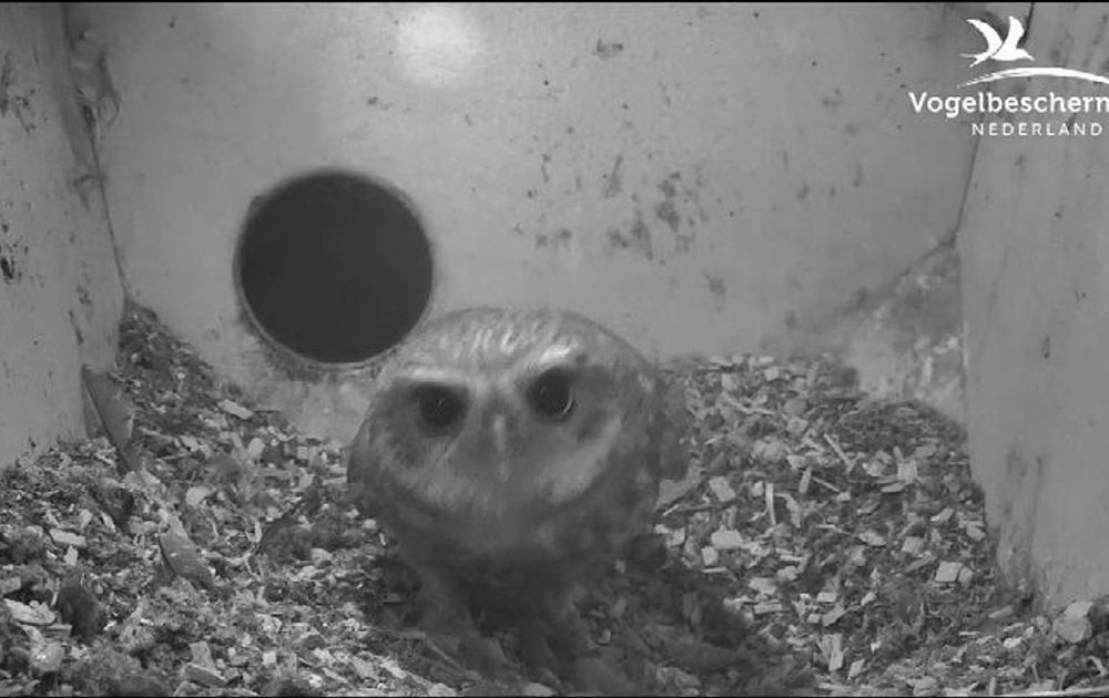 Om 1:36 uur stuift man zijn opgeruimde nestkast in. Een andere steenuil met interesse en ring! verschijnt op de tak. Daarna volgt een paar uur voorzichtig aftasten. De eerste fysieke toenaderingen zijn een paar uur later en om 4:20 uur lokt man de nieuwe uil de kast in. Of zij graag op de camera wil is nog de vraag........... Locatie Winterswijk