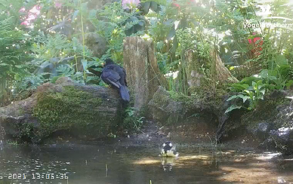 Een badende merel wordt gepakt door een roofvogel, ook in de sterk vertraagde beelden is moeilijk te zien, welke roofvogel dit op zijn geweten heeft.