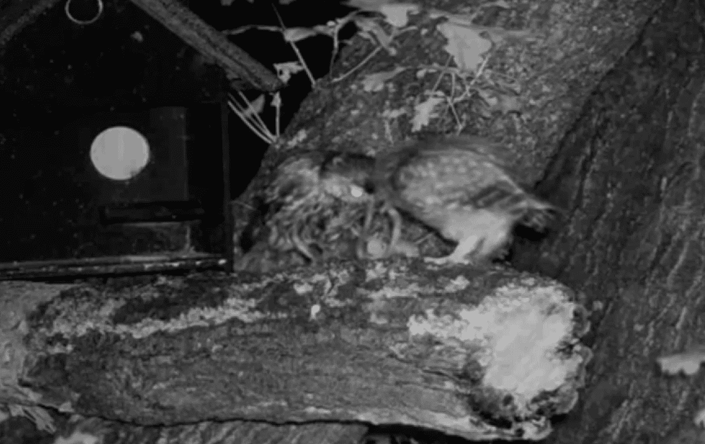 Vrouw steenuil ziet erop toe dat kuiken BOS de hele worm naar binnen slurpt.