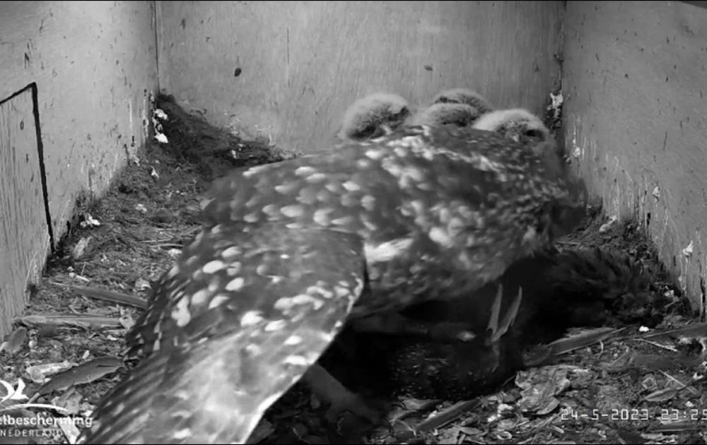De steenuilen blijven even gericht op vogels. Nu is het een volwassen spreeuw. Die weegt ongeveer 75 gram. Evenveel als twee of drie muizen.
