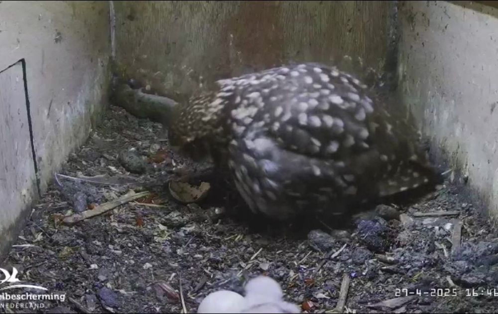 29 april 15:59 uur: Na 33 uur piepen en ploeteren is het eerste kuiken zichtbaar uit het ei gekomen. Wanneer de volgende?