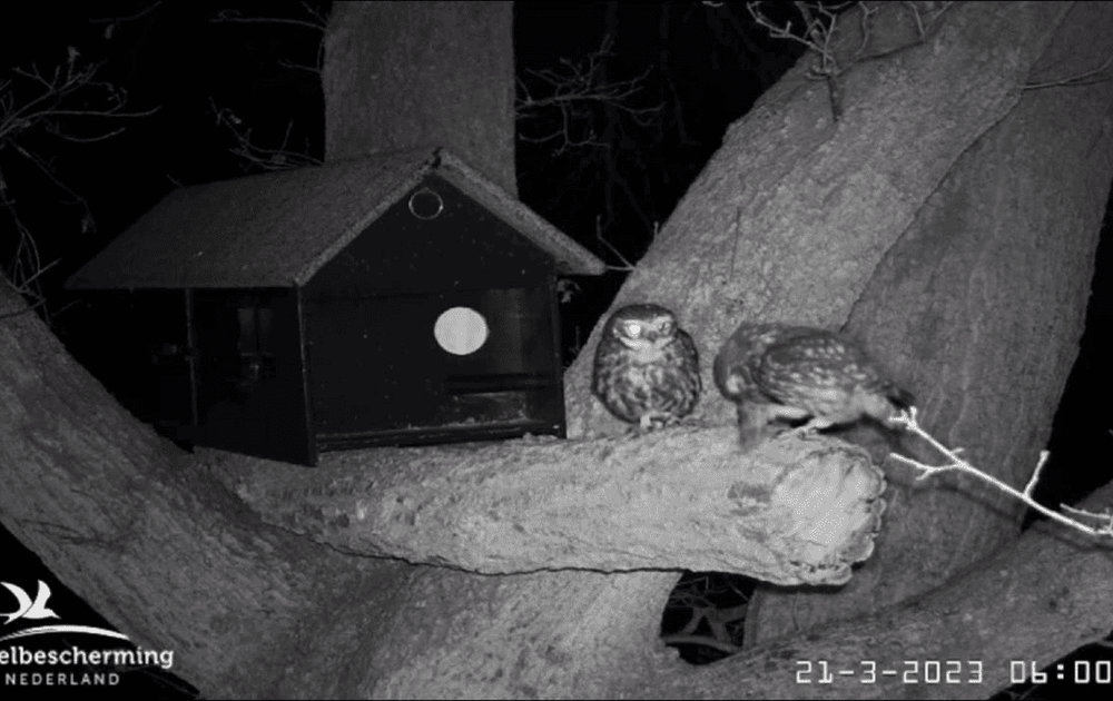 Man steenuil brengt drie muizen voor vrouw steenuil in de nestkast. Vrouw verblijft dan ook lang in de kast deze dag.