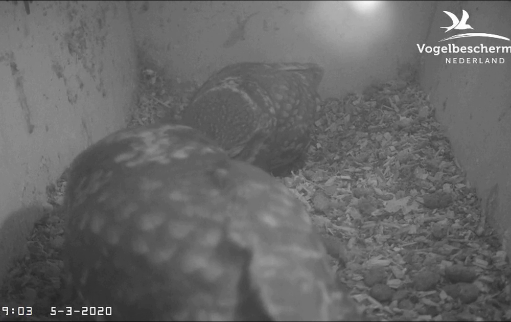 Midden in de nacht was er een eerste volledige nestplaatsverkenning. Man steenuil gaat voorop, wijst een goede nestplek aan (de nestkast), gaat liggen waar de eieren kunnen komen, en vertrekt weer.