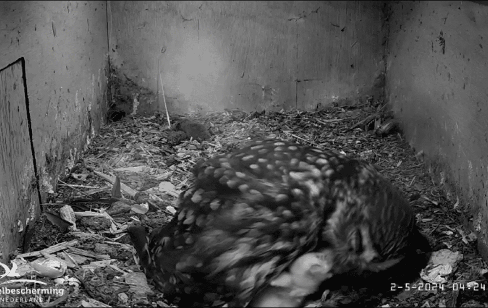 Vrouw steenuil voedert de vier kuikens voor de eerste keer met een muis uit de voorraad. Waarschijnlijk zijn alleen de oudste kuikens actief.