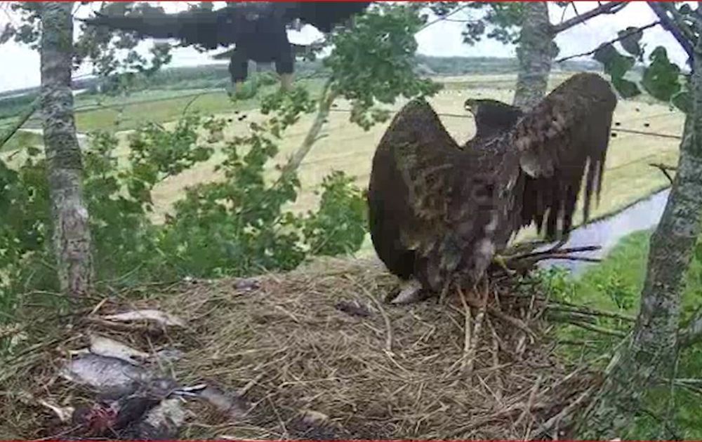 Voor het eerst in de webcamgeschiedenis van Beleef de Lente komt een uitgevlogen zeearendjong terug op het nest. Was het de grote hoeveelheid netjes uitgestalde prooien op de nestrand die lokte? Kijk zelf