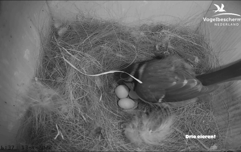 Vrouw pimpelmees heeft maandag 11 april geen ei gelegd, maar dinsdag 12 en woensdag 13 april gelukkig weer wel.