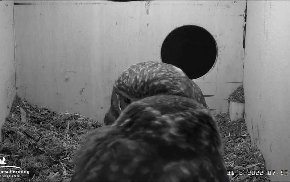Na een nacht van waarschijnlijk voedsel zoeken, komen de steenuilen thuis. Het begin van een rustige dag,