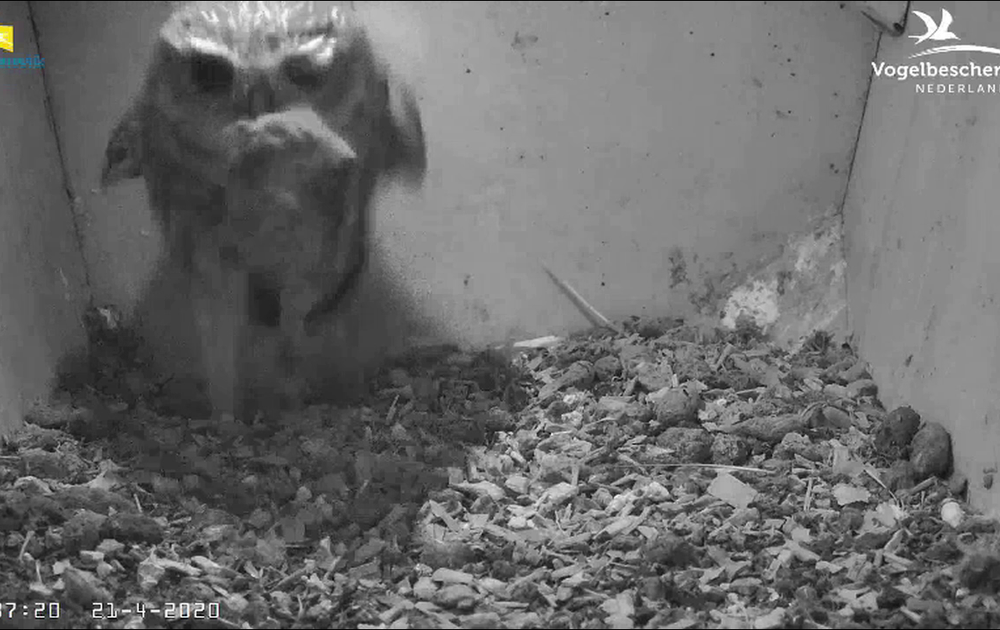 Eindelijk hebben de steenuilen weer eens een muis gevangen, de eerste sinds 28 maart. Is het geen echte muis, maar een spitsmuis. Geen knaagdier maar een insecteneter. Smaakt ook niet zo lekker, maar waarschijnlijk gaat vrouw steenuil de spitsmuis wel opeten.