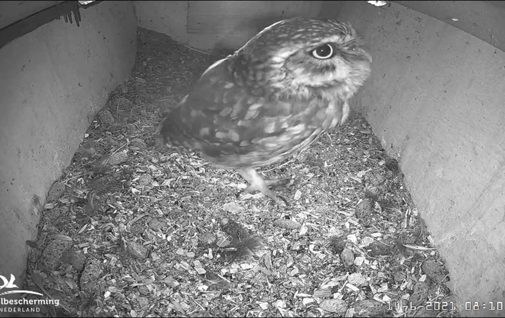 De steenuilen waren wel wat lang weg bij de nestkast na de verstoring bij het weghalen van de eitjes. Vrouw steenuil was al een paar keer langs de kast gekomen en ging om 8:10u naar binnen. Geen reactie te merken: ze poetste en sliep vooral (niet te zien op de clip) en liep een inspectie-rondje door de kast. Ze bleef 1 uur en 45 min.