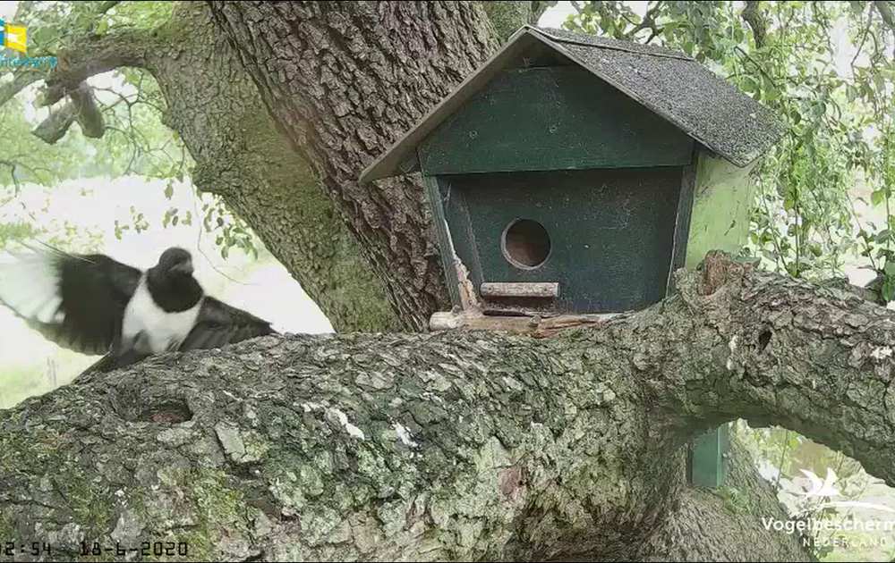 Ekster is slechts heel kort bij de nestkast. Geen ouder steenuil in beeld, dus een jong doet het werk.