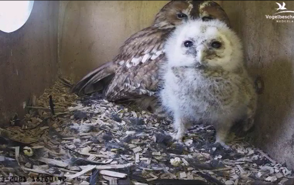 Staan deden ze wel vaker maar nu rekt een van de kuikens zich twee keer achter elkaar uit en kijkt nieuwsgierig in de camera.