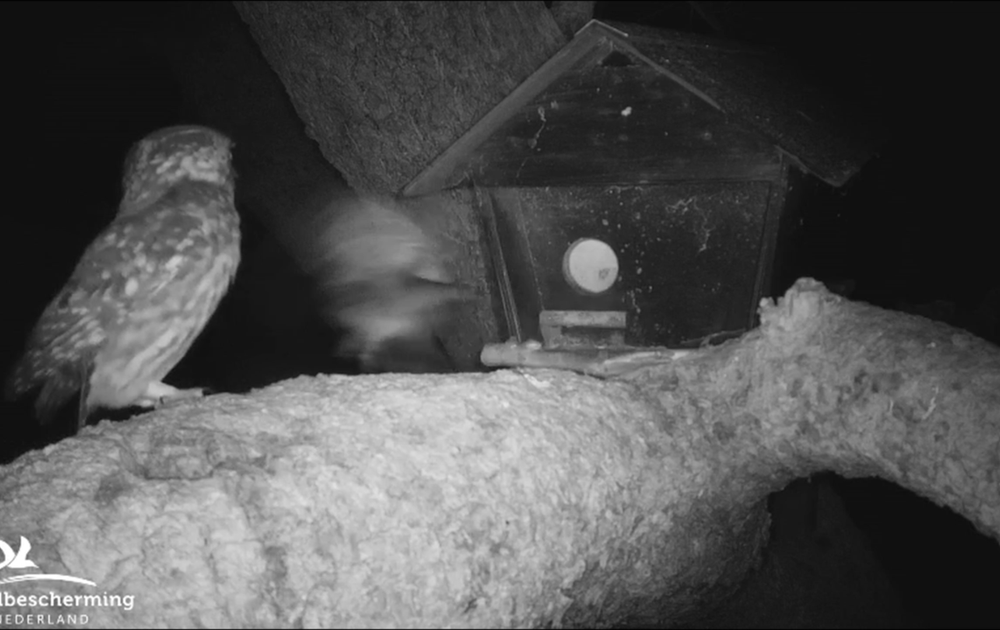 Man steenuil schrikt van kraaien, later van iets boven in de boom en dan nog een derde keer. Van een romantisch avondritueel komt maar weinig terecht.