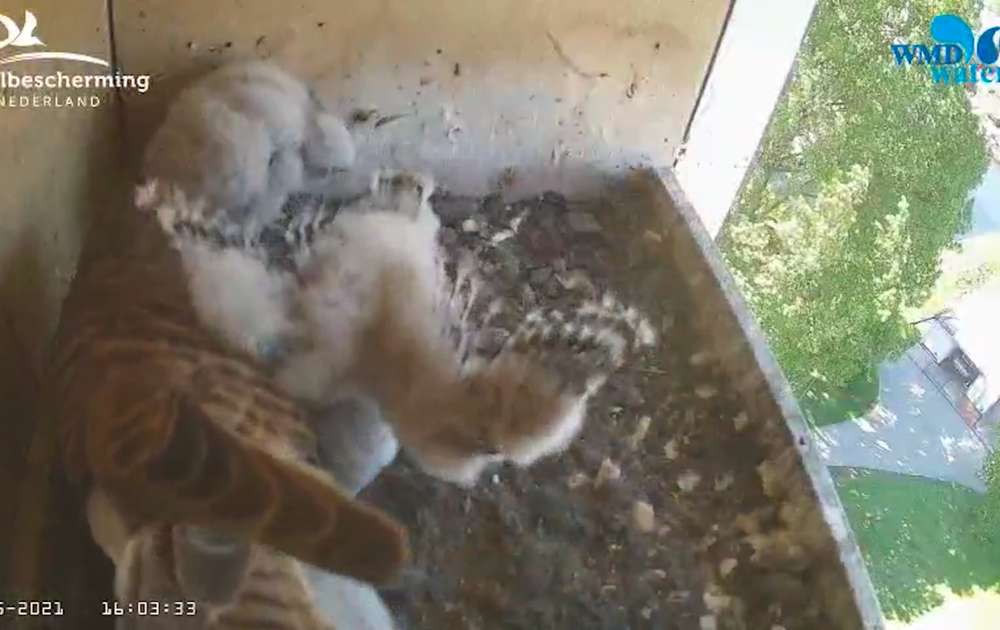 De kuikens zijn al hard aan het oefenen met de vleugels. Vrouw moet uitkijken voor alle rondslaande vleugels van de kleine valkjes.