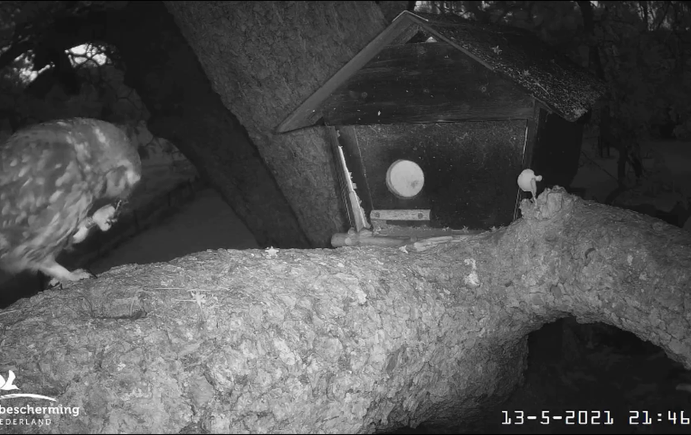 Vrouw steenuil neemt een broedpauze. Man serveert het eten op het terras voor de nestkast, nog net voor 22 uur
