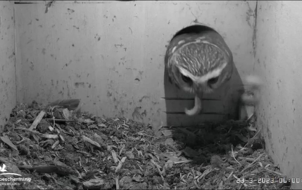 Man en vrouw steenuil zijn nu ook in de nacht meer op de nestkast gericht. Man is 4x bij de nestkast geweest tussen deze beelden van een paring en het brengen van een rups.