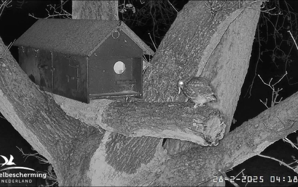 Man steenuil komt 3x op de tak voor de nestkast met een prooi: 2x larve, 1x muis,