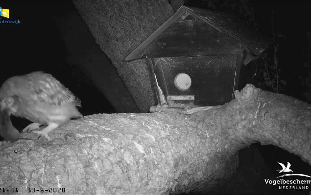 De "bewust" ongeringde jonge steenuil krijgt van vrouw (of man) steenuil een woelmuis. Het jong kan de muis ongestoord in 4 minuten opeten buiten voor de nestkast.
