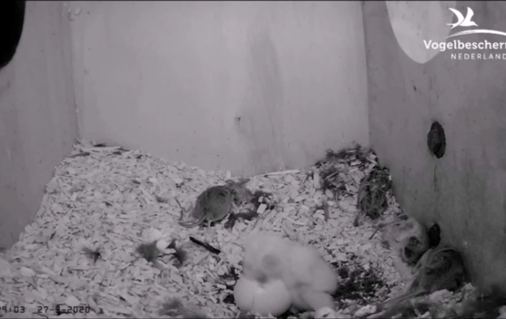 Net voordat het licht wordt, kan vrouw bosuil even de kast uit voor een sanitaire stop. Dan zien we het kuiken in volle glorie. Een kleine activeling!