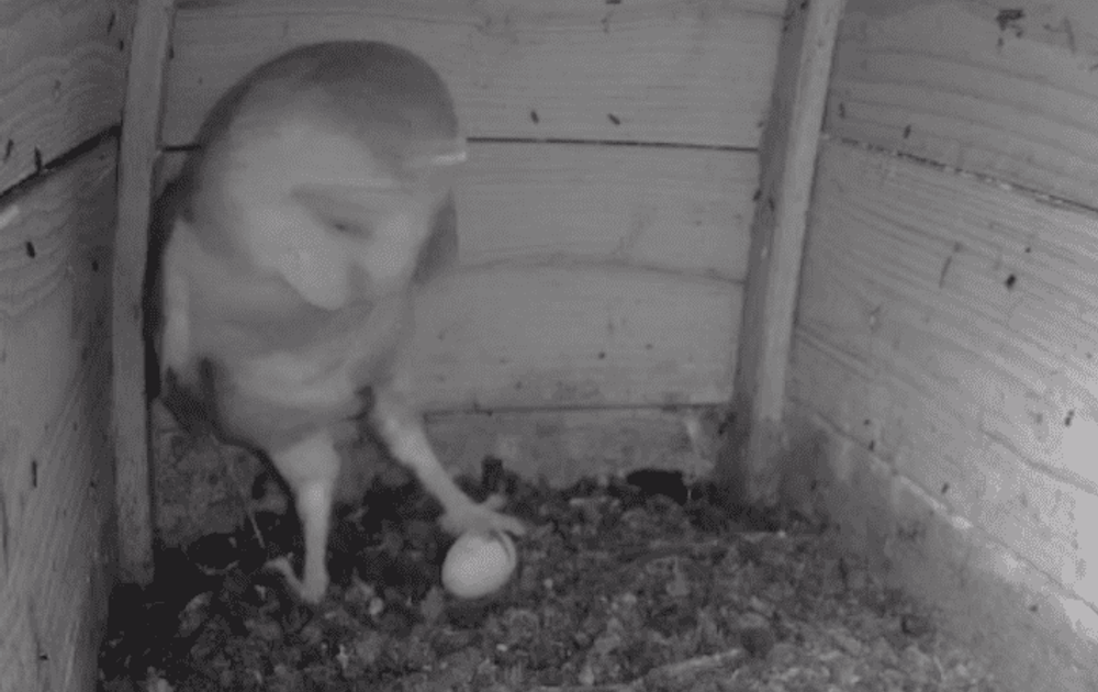 Dit is de eerste nacht dat vrouw kerkuil op het ei broedt. Dat zal toch wel even wennen zijn!