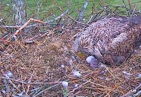 Veel te zien vannacht: kuiken slokt met veel moeite een bijna halve muis naar binnen en....