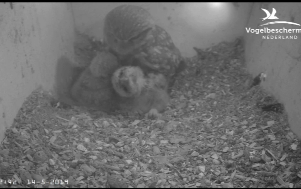 De twee kuikens passen niet meer onder vrouw steenuil. Een mooie kans voor een kuiken om te fixeren.