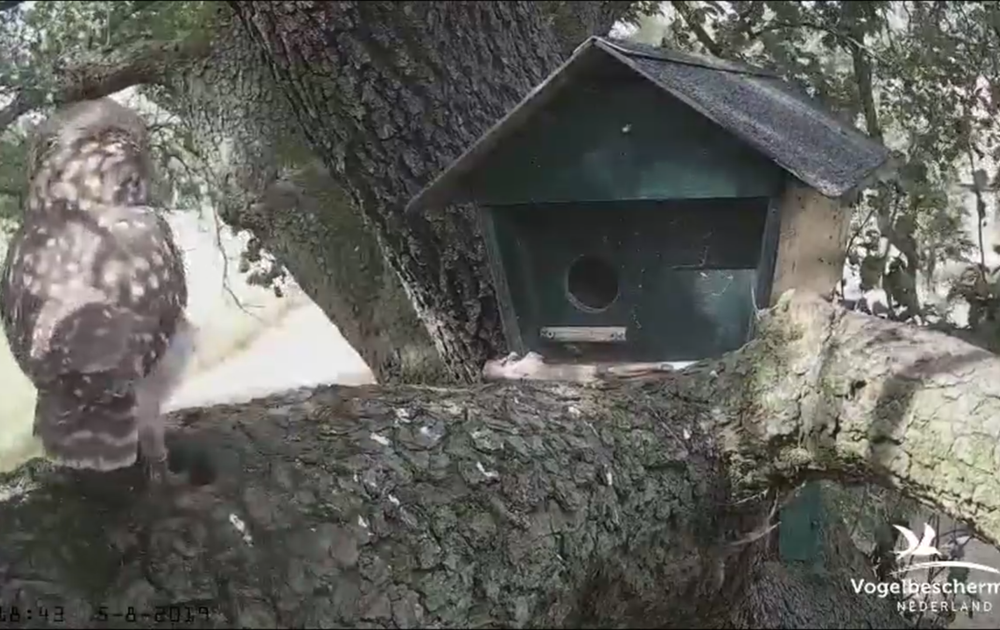 Een nogal hyperactieve gaai verschijnt op de tak. Het rechtsgeringde steenuilje komt ook in beeld en vindt het veiliger de nestkast in te gaan.