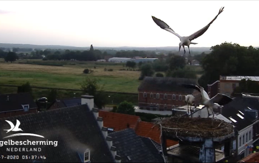 Vanochtend zijn de kuikens onrustig. Er is weinig wind, alle tekenen zijn gunstig voor het uitvliegen. Zeker deze sprong, weer een nieuw record voor dit jaar.