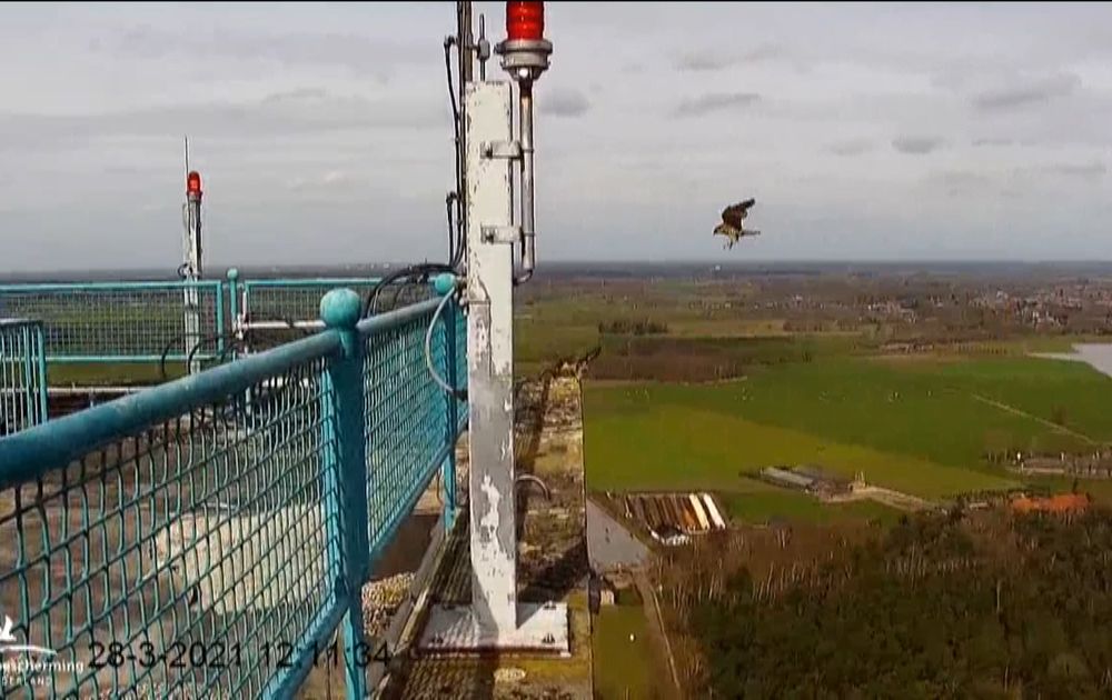 Door de harde wind wiebelt de camera, en is niet te zien of dit inderdaad vrouw is, maar erg fanatiek wordt de tweede valk niet verjaagd.