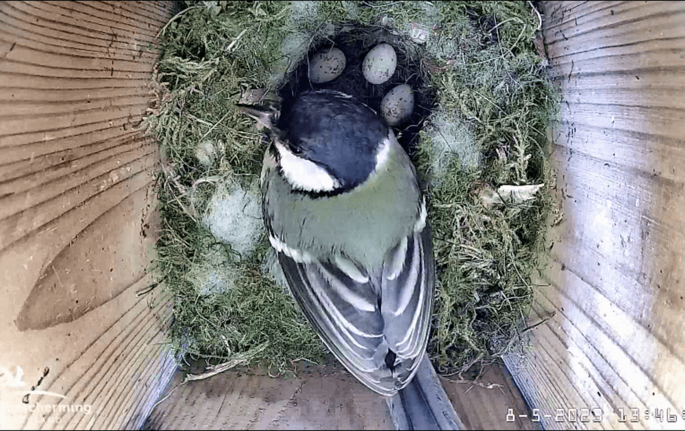 Vrouwtje vrolijkt de lange broeddagen op door gathangen en de erg diepliggende eitjes te controleren.
