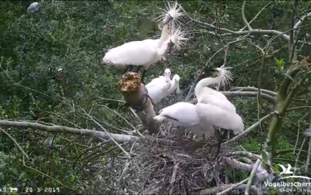 Wat een gedoe... Nog steeds komt er een stel beide nesten op de berk lastig vallen. Vandaag moest vooral het voorste nest het ontgelden. Eerst vanmorgen al takken pikken, dan paren op de berk... Het wordt vrouw van het voorste nest teveel en grijpt in. Maar of dat wat helpt...