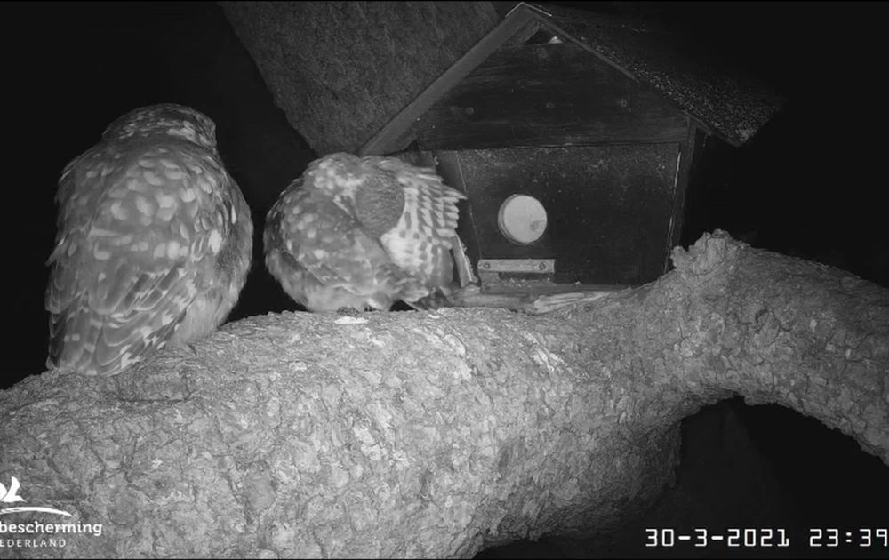 Vrouw steenuil doet 20 maart overdag goed haar best in de nestkast, toch kwam er geen derde ei. Dan maar weer een feestje.