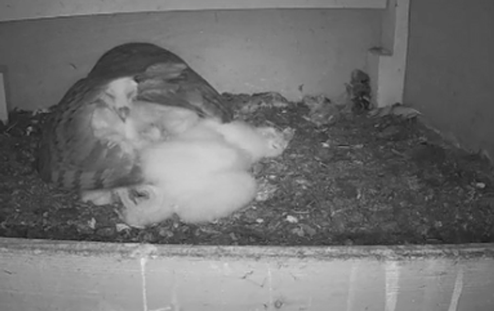 Met zeven opgroeiende uilskuikens is er steeds minder plaats om je kroost warm te houden.