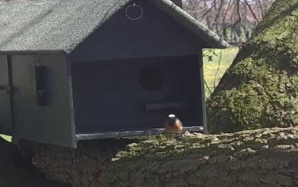 Een gekraagde roodstaart waagt zich in het sluisje van de nestkast.