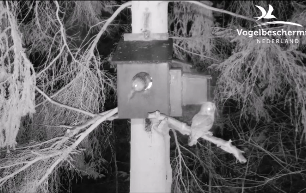 Vrouw bosuil neemt de muis niet aan en enkele ogenblikken later verlaat ze de kast met de voorraadmuis. Man bosuil achter haar aan om zijn muis nogmaals aan te bieden.