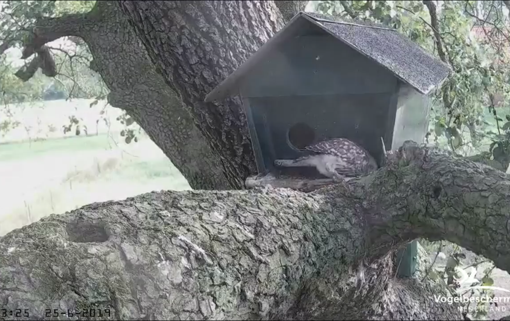 Het rechtsgeringde kuiken bergt een muisrest op onder de nestkast (4:41u).