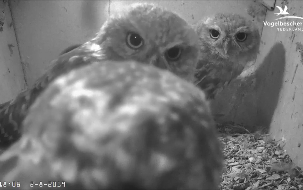 De twee jongen snellen de nestkast in. Man steenuil ontvangt ze ijzig. De jongen proberen het ijs te breken met wat bedelende geluidjes, maar geven dat na een paar minuten op. en vertrekken.