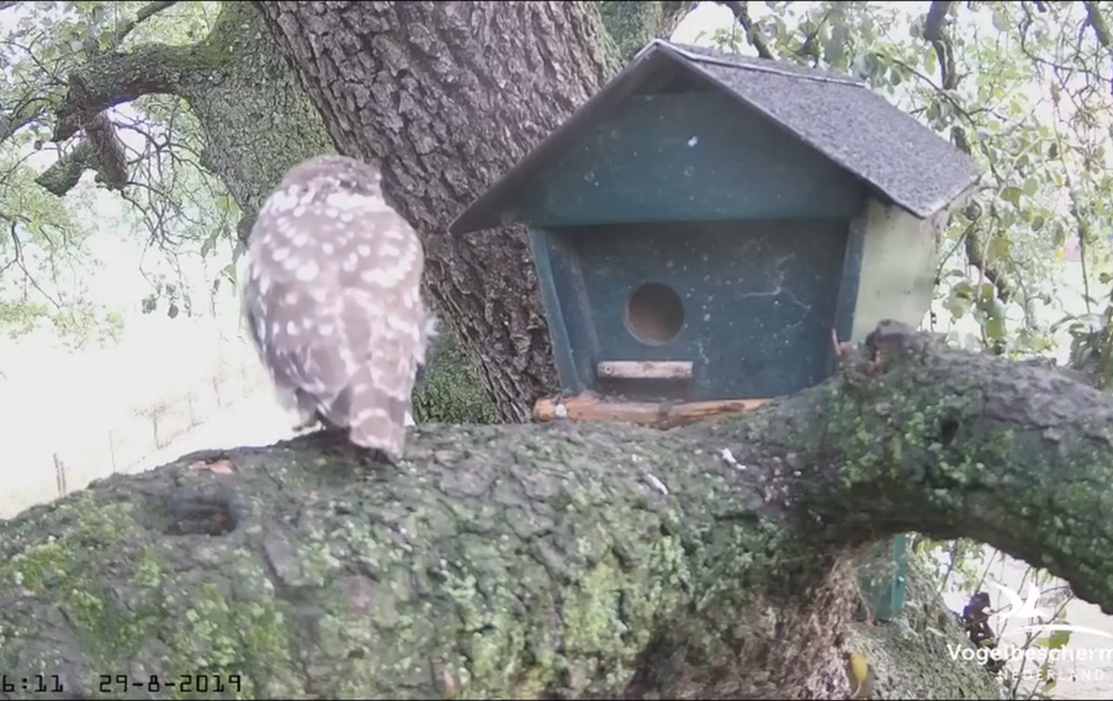 Echt noodweer in de vroege ochtend van 29 augustus in Winterswijk. Gevolgen zijn o.a. de uitval van het geluid bij de beelden en een natte vrouw steenuil. Zij komt bij voor en in de nestkast en vertrekt dan weer de wereld in.